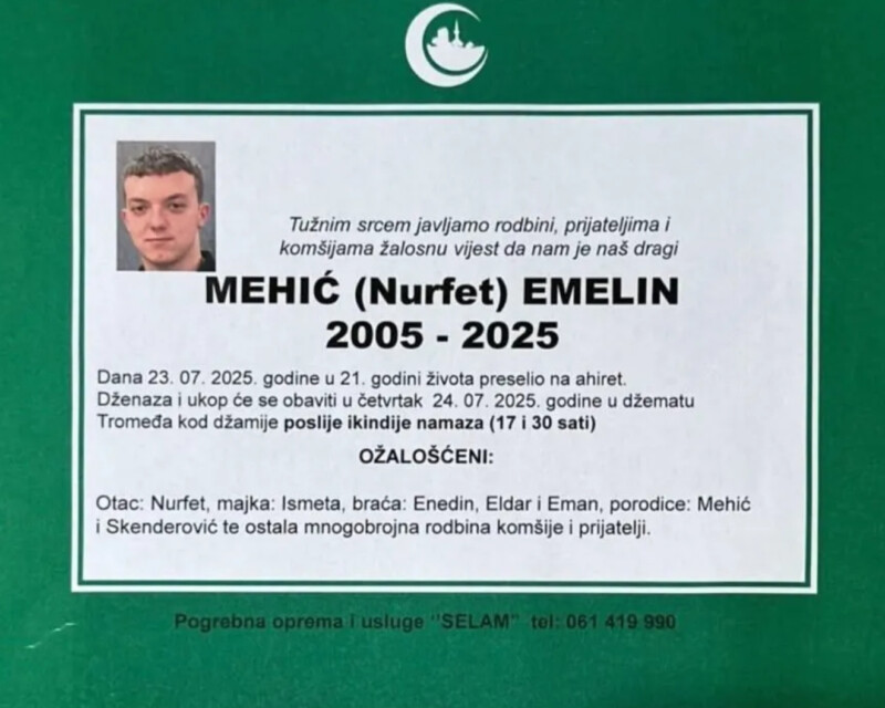Dženaza i ukop Emelina Mehića obavit će se u četvrtak, 24. jula, u džematu Tromeđa, kod džamije, poslije ikindije-namaza u 17:30 sati. Očekuje se prisustvo velikog broja građana, prijatelja i sportskih kolektiva koji će doći da se oproste od tragično preminulog mladića.